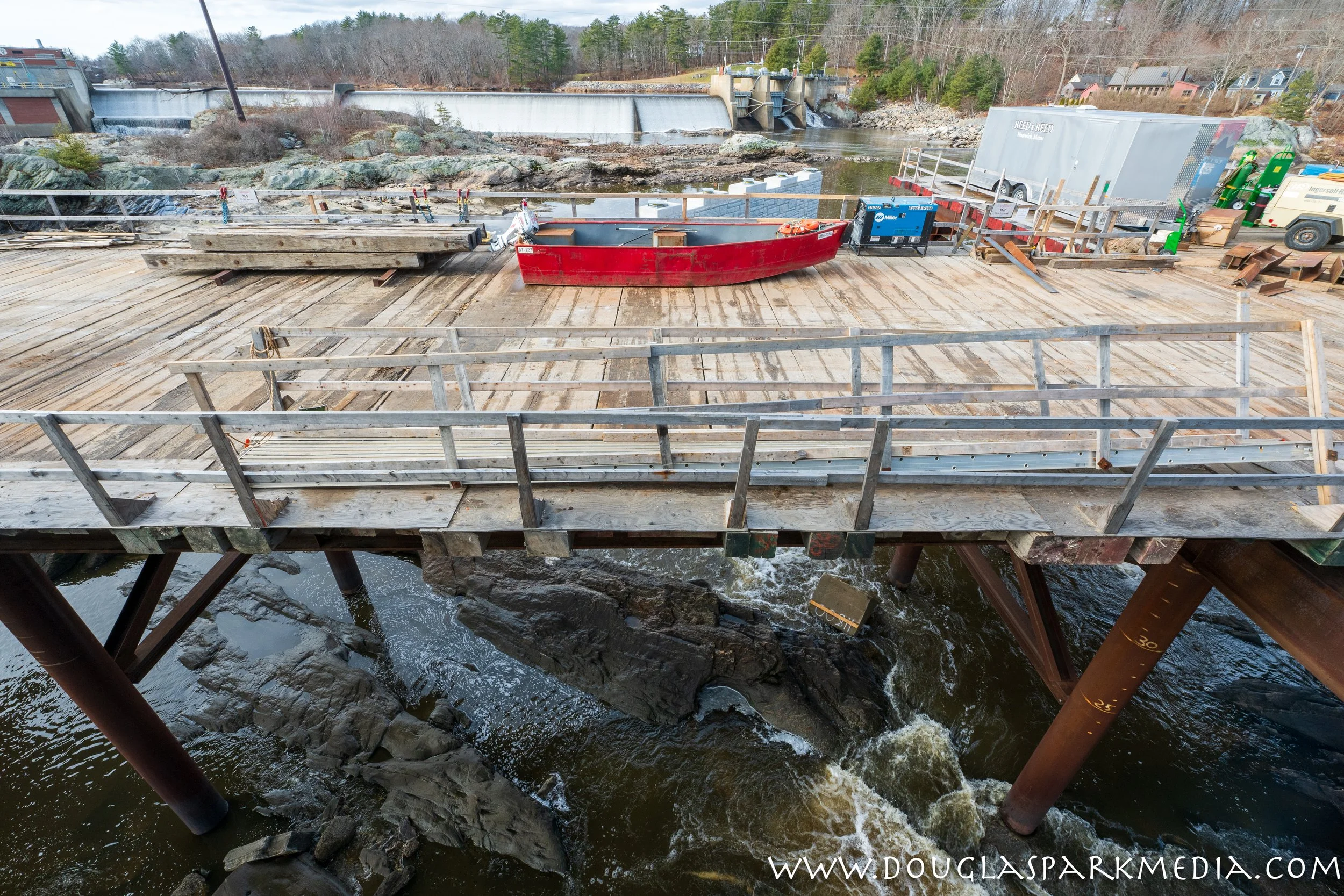 Looking through the view finder, I hoped to frame the shot to include a bit of what remains of the falls in the foreground, just about at the traditional head of the tide in the Androscoggin, the construction decking from which the new bridge is being built, and the current version of the dam. I also hoped to capture the fish ladder hard at the left of my view beneath the brick of the Cabot Mill in Brunswick, or Shad Island, a lump of rock whose very name has become an anachronism.