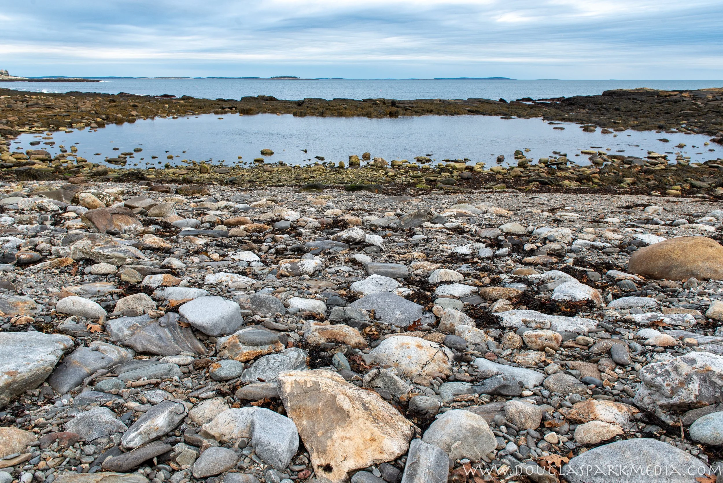 Twice between succeeding dawns, as the waters abandon pursuit of the beckoning moon and fall back, foot by foot, periwinkle and starfish and crab are cast upon the mercy of the sands. Every heap of brine-drenched seaweed, every pool forgotten by the retreating sea in recess of sand or rock, offers sanctuary from sun and biting sand. In the tide pools, seas in miniature, sponges of the simpler kinds encrust the rocks, each hungrily drawing in through its myriad mouths the nutriment-laden water. Starfishes and sea anemones are common dwellers in such rock-girt pools. Shell-less cousins of the snail, the naked sea slugs are spots of brilliant rose and bronze, spreading arborescent gills to the waters, while the tube worms, architects of the tide pools, fashion their conical dwellings of sand grains, cemented one against another in glistening mosaic. (Undersea, Rachel Carson, The Atlantic Monthly, September 1937. This tide pool is in New Harbor at the Rachel Carson Salt Pond Preserve. It is a Nature Conservancy property and accessible to the public)