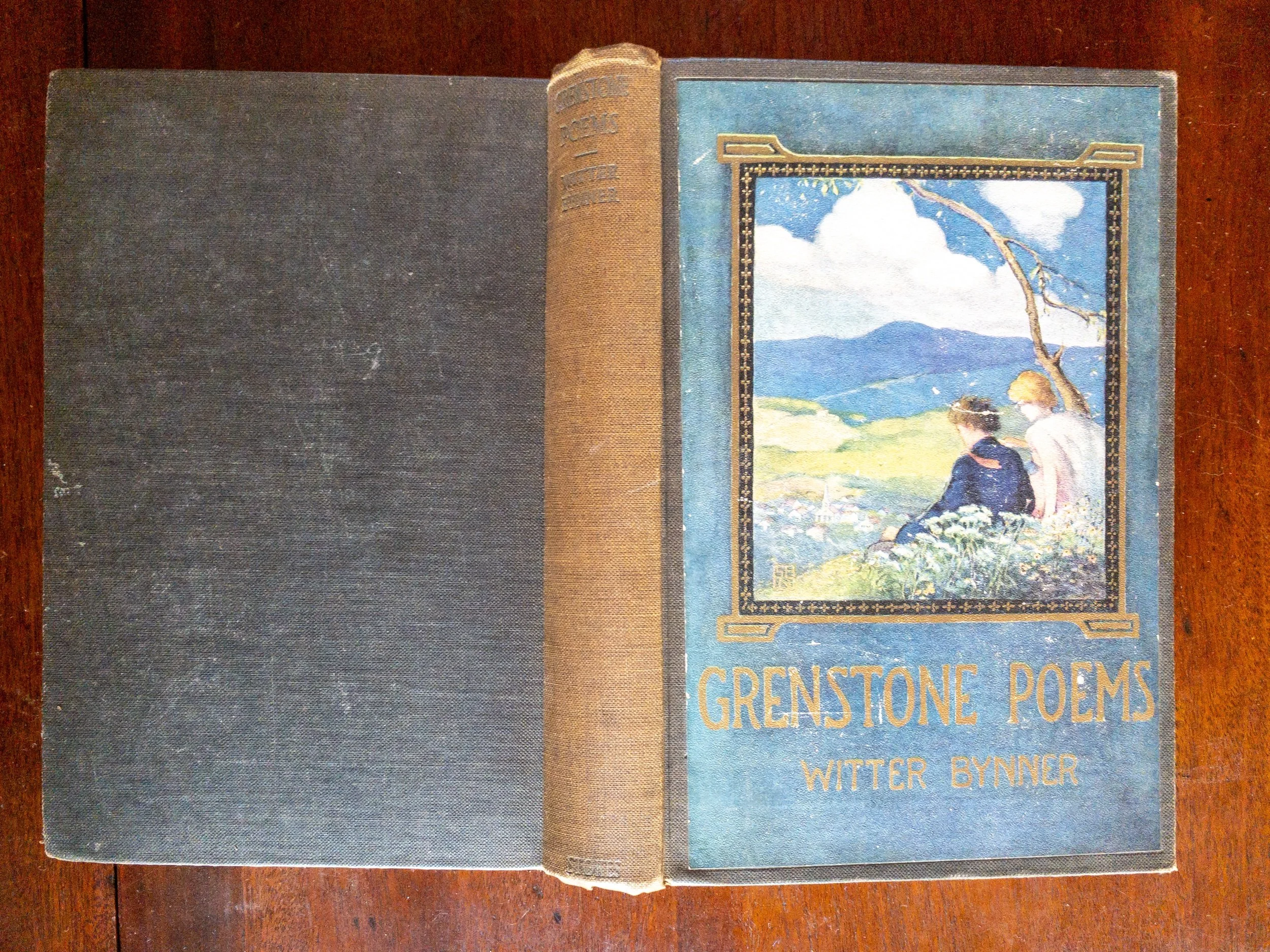 These things I learned while reading up on Renascence in Nancy Milford’s truly excellent biography of Millay, Savage Beauty. Engaged in some prosaic background reading for another project Witter Bynner’s name popped off the page at me. I recognized the name but knew not why until I looked in my own listings on Abebooks and found Grenstone Poems. The book is in good shape and Bynner had himself a fine career, consorting with all the heavy hitters. One of the things that had made me price it a little higher than my usual threshold (least expensive similar edition with seller created images) was the cover illustration and the frontispiece. I’ve put some time into exploring cover design in the period before dust jacket design overwhelmed cover design as a distinct practice and sidelined cover design. I may value the era more than the market does. But the fantastic frontispiece is the clincher. It bears so much scrutiny; it is perplexing, and well worth $37 in its own right.